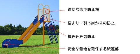 | (一社)日本公園施設業協会策定の『遊具の安全に関する規準』には各種遊具の詳細な規定が明記されています。弊社のご提案する遊具についても最新版の規準に準拠し、身体各部の挟み込みの防止や、各部位の尖端・角・縁等の処理、落下の防止対策などの規定を満たした設計・デザインを行なっています。 |