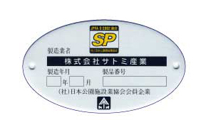 | 製品には、(一社)日本公園施設業協会から認定されたSP表示認定企業としての証明となる「SPマーク」・「SPLマーク」を表示した、「SP製造表示ラベル」・「SPL製造表示ラベル」を貼付します。これは生産物賠償責任保険に加入している事の証でもあり、製造者としての責任や品質保証を明らかにする為のものです。 |