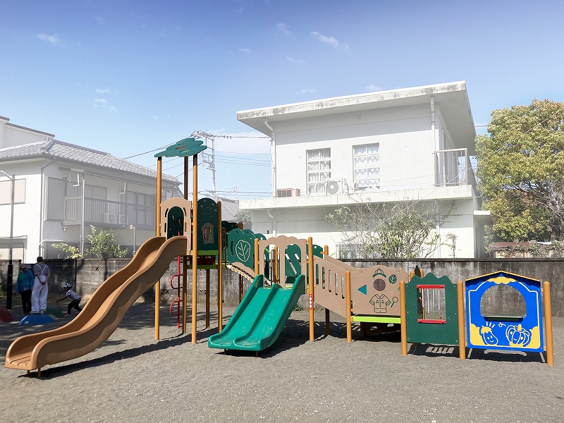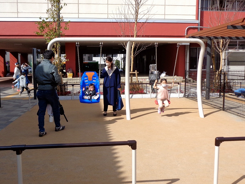 要素を保護者の方が行き届く範囲にまとめ、初めての公園遊びでも安心して遊ばせることができるよう配慮しています。